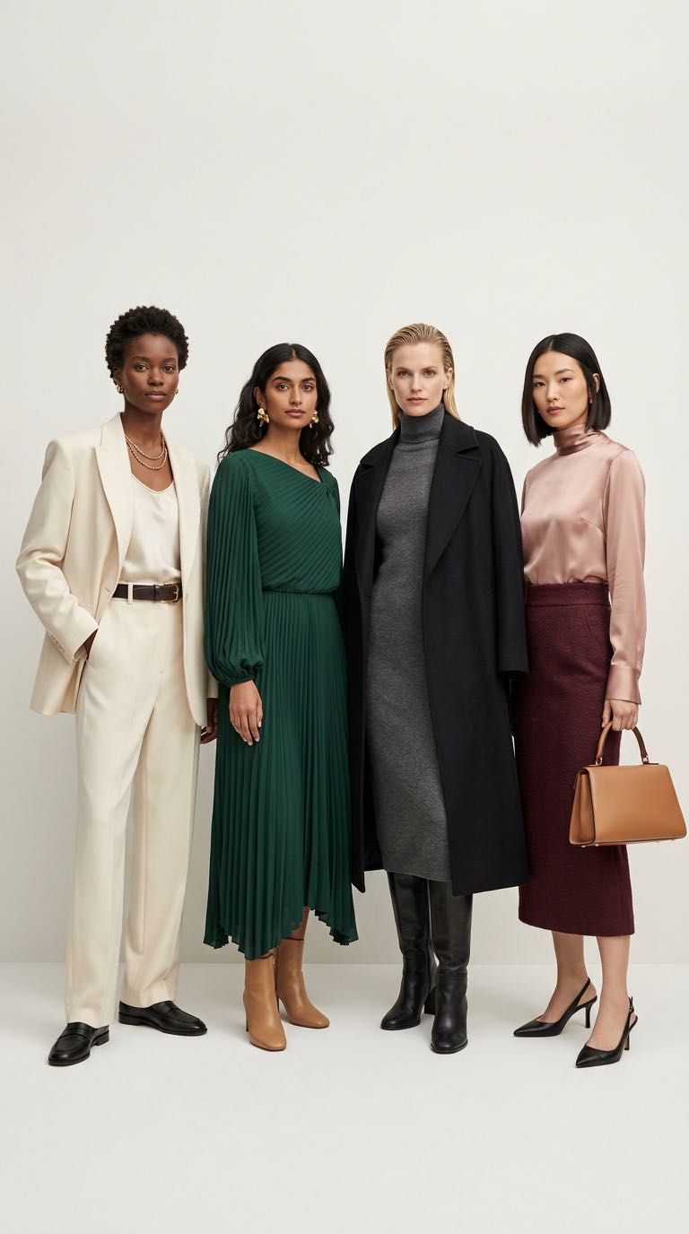 タイトスカートスーツとシルクブラウスの組み合わせは、ビジネスエリートとして第一線で活躍する30代女性の装い。知性と美しさが融合した究極のキャリアスタイル。