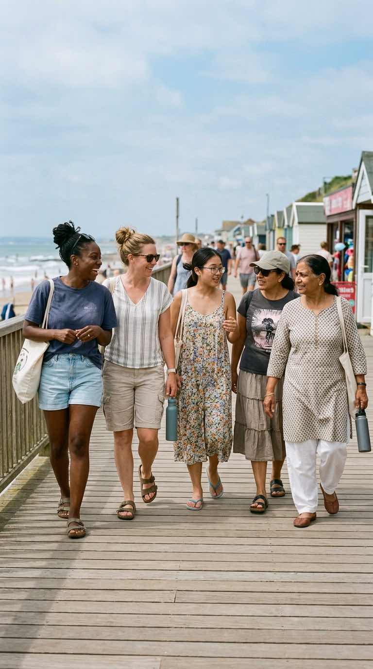 ブルーストライプのマリンボートネックと白リネンパンツは、海辺を舞台にした上質なアウトドアスタイルの完成形。風に揺れる髪とマリン感が絶妙に調和する。