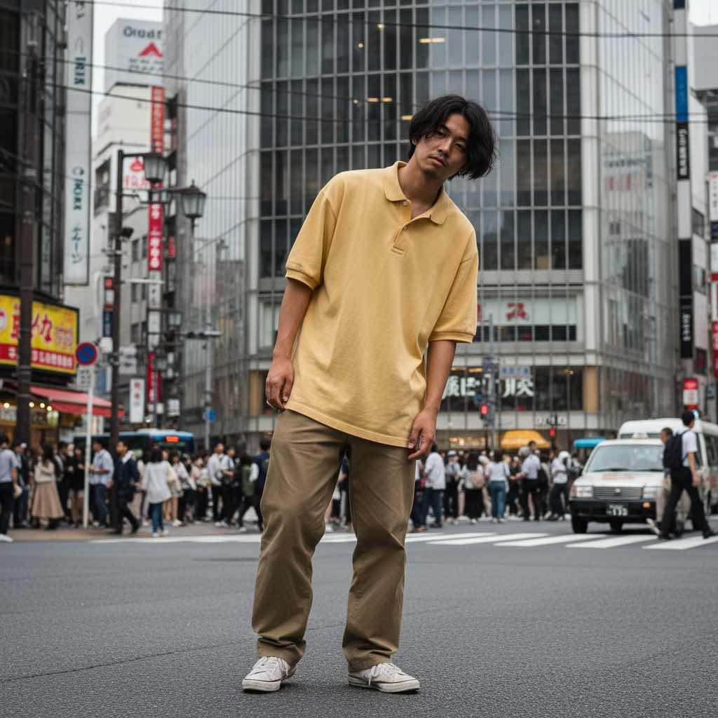 テックウェアジャケットとカーゴパンツ、リフレクティブスニーカーを組み合わせたサイバーストリートスタイル。東京の夜のネオンと最高の相性を見せる。